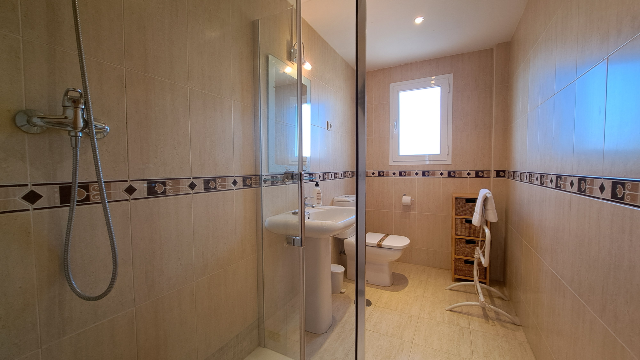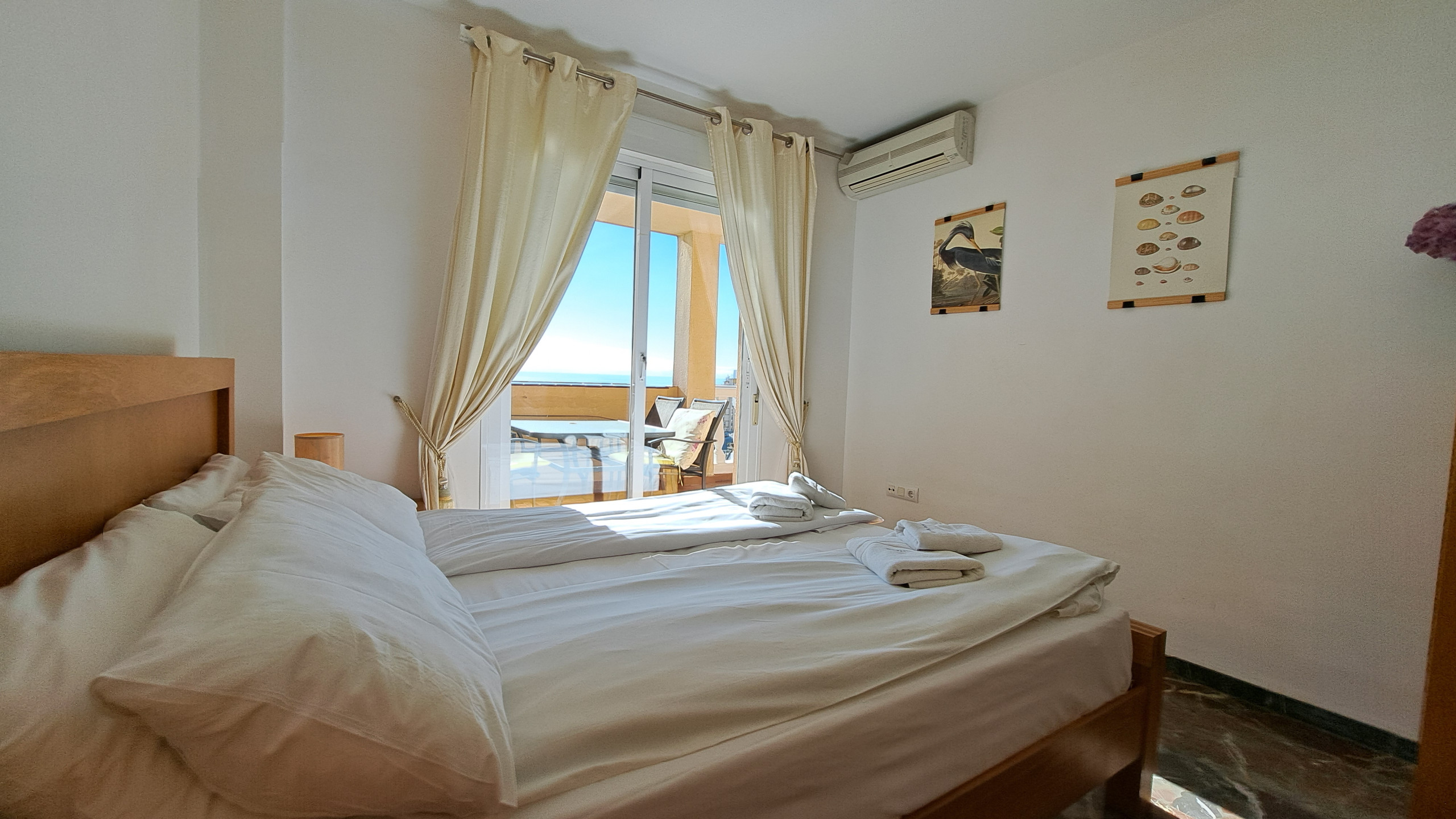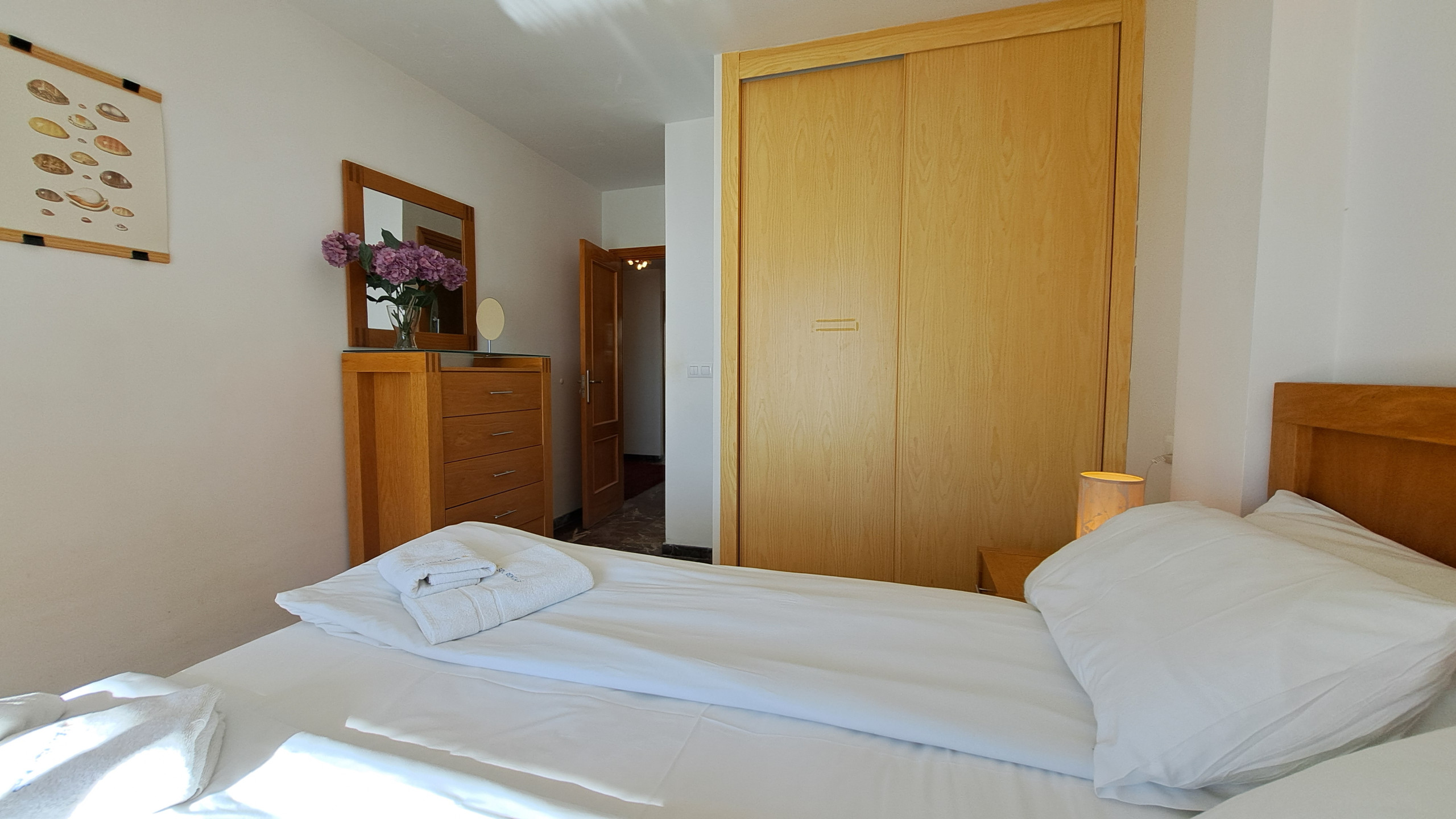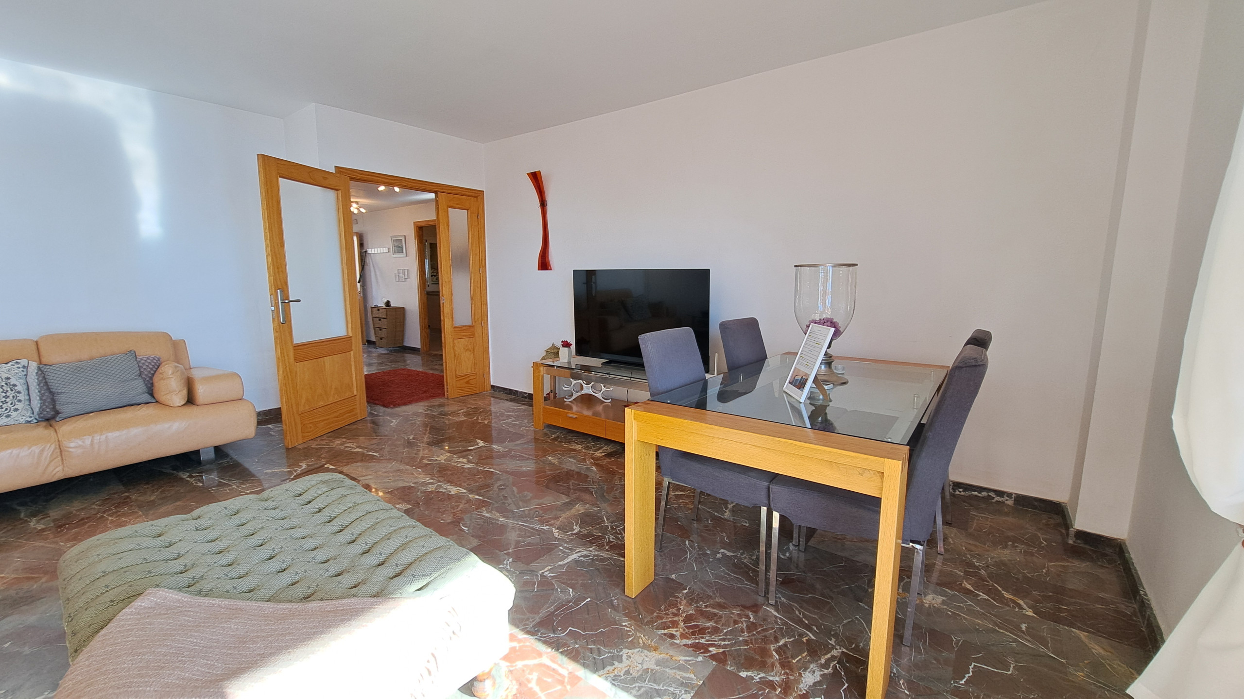El apartamento ofrece un salón grande con 2 cómodos sofás, TV y una mesa de comedor y acceso directo a la gran terraza soleada con mesa de comedor para 6 personas, cómodo sofá exterior y sillones más 2 tumbonas para relajarse y tomar el sol. Cocina totalmente equipada con todos los electrodomésticos y utensilios. Hay 2 dormitorios, ambos con armarios empotrados, uno con cama de matrimonio y otro con 2 camas individuales. Además 2 cuartos de baño, uno con ducha y 1 con bañera. Wi-Fi de fibra óptica y aire acondicionado en toda la casa. Proporcionamos ropa de cama, toallas, plancha y secador de pelo.