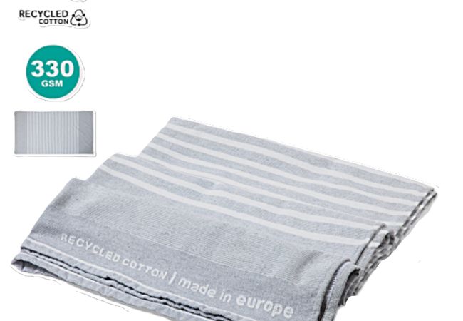 Size 150 x 80 cm. Beach Towel with a nature line and grey finish. Made in Europe and made from a combination of GRS recycled cotton and 330g/m2 polyester. With GRS (Global Recycled Standard) certification which certifies the recycled origin of the material used in the manufacture of the product.